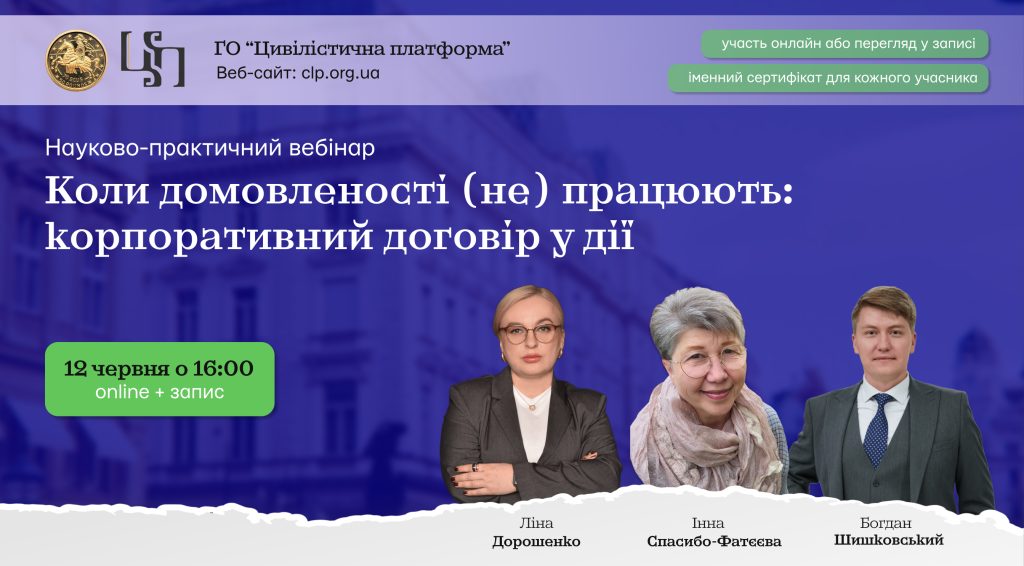 12.06.25 відбувся науково-практичий вебінар «Коли домовленості (не) працюють: корпоративний договір у дії”, на який мала честь бути запрошеною в якості спікера.