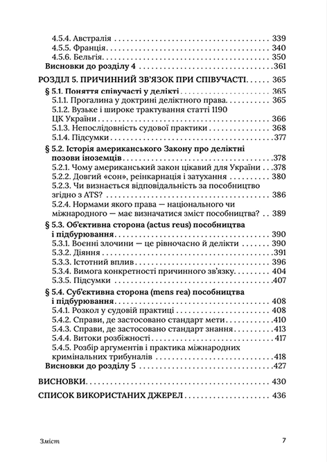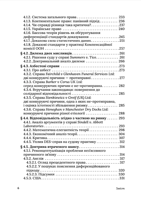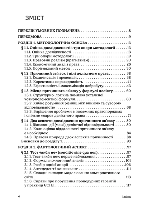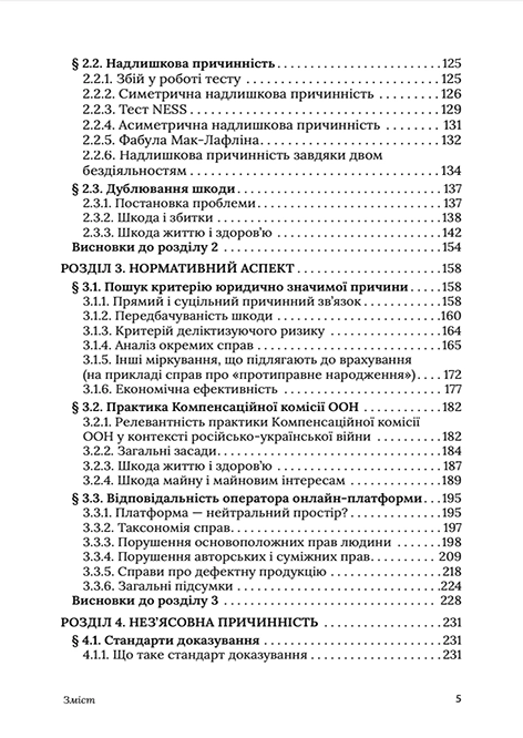 У книзі досліджується причинний зв’язок як умова недоговірної відповідальності за завдану шкоду. Визначається місце причинного зв’язку у формулі делікту, його співвідношення з іншими елементами (виною та шкодою) та роль у контексті призначення й функцій деліктного права. Обґрунтовується, що дослідження судом юридично значимого причинного зв’язку включає два аспекти: фактологічний і нормативний. Перший передбачає перевірку обставин справи тестом «якби не», або більш точною його версією — тестом NESS. Другий — передбачає оціночне судження щодо того, чи є причинний зв’язок достатньо міцним, щоб виправдати покладання відповідальності. Проблема нез’ясовного причинного зв’язку розглядається з точки зору постмодерної епістемології у взаємозв’язку із аналізом стандартів доказування. Стандарти доказування, у свою чергу, вивчаються із застосуванням Баєсової теорії ухвалення рішень. Останній розділ, присвячений причинному зв’язку при співучасті, включає аналіз питань, пов’язаних із відповідальністю за шкоду, зумовлену війною.